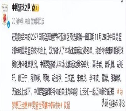 北京时间11月27日,中国男篮官方公布世预赛对阵韩国队的12人名单,与亚洲杯时期相比,赵睿,赵嘉义,王俊杰,余嘉豪缺席,新增张镇麟,曾凡博,周琦,王岚嵚。