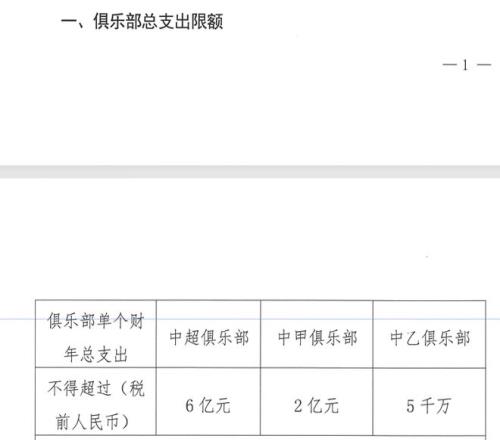 根据新规,俱乐部单个财年(1月1日至12月31日)总支出限额分别为:中超不超过6亿元、中甲不超过2亿元、中乙不超过5000万元。该总额包含青训及女足费用,但不含基础设施建维费用。