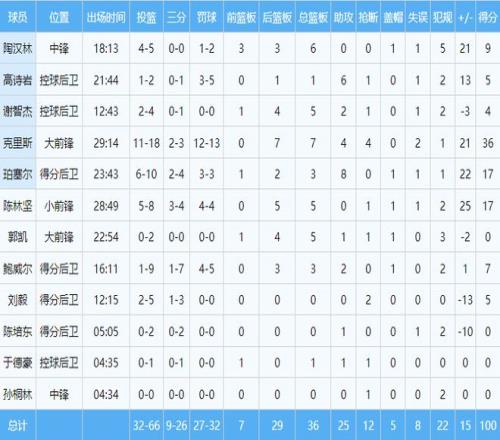 数据方面,克里斯36分7篮板4助攻4抢断,填满数据栏,其中得分创赛季新高。珀塞尔高效砍下17分3篮板8助攻。陈林坚三分球4投3中,得到17分,展示了冷面射手的本色,另外,他的正负值高达正25,为全场之最。其他球员,陶汉林9分6篮板,鲍威尔7分,高诗岩5分6助攻,刘毅5分,谢智杰4分。