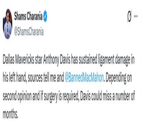 北京时间1月10日,据名记Shams报道,达拉斯独行侠球星安东尼-戴维斯左手韧带遭遇损伤。根据二次诊断结果以及是否需要接受手术,戴维斯可能缺席长达数月的比赛。